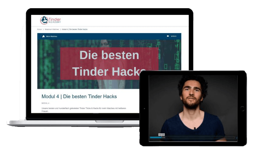 Insgesamt habe ich 4 Module mit 20 Videos und über 6 Stunden Content mit allen meinen Expertenstrategien und getesteten Tinder Techniken für dich vorbereitet. Alle Module bauen dabei logisch aufeinander auf und liefern dir ALLES was du für ein unwiderstehliches Tinder Profil brauchst.