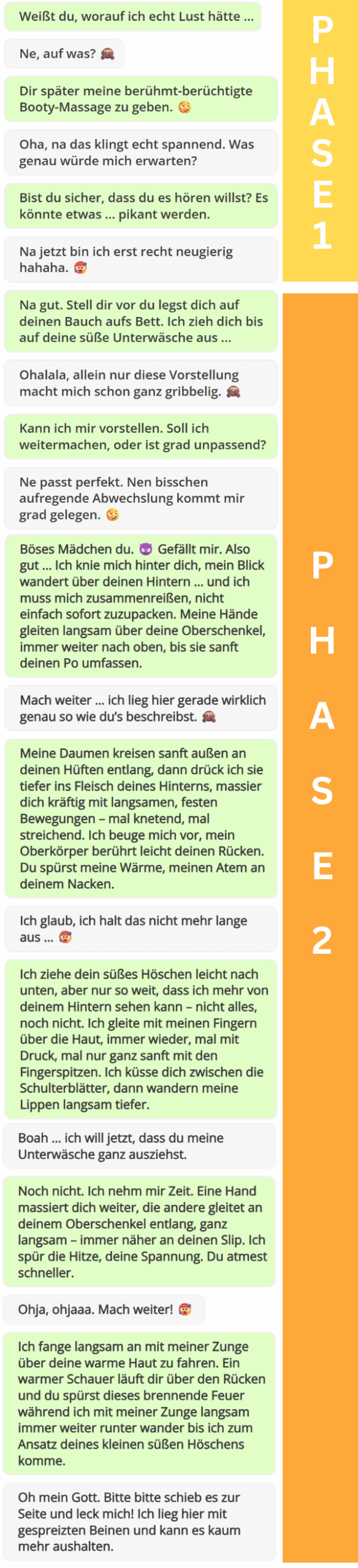 Wenn der Chatpartner darauf positiv reagiert, weitermachen mit explizitem Sexting und Dirty Talk wie unten in Phase 3 beschrieben.