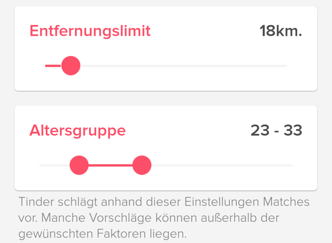 Denn dort kannst du ja einstellen, in welcher Entfernung und in welcher Altersgruppe dir andere User beim Swipen angezeigt werden sollen.