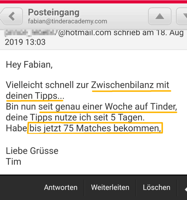 Nicht umsonst gelten wir mittlerweile als die führenden Tinder Experten in Deutschland und helfen durch unseren Blog, unsere Videokurse, unsere Facebook Gruppe und unser gratis Tinder Coaching per Email jeden Monat über 100.000 Leuten, wie sie mehr Erfolg auf Tinder haben können.