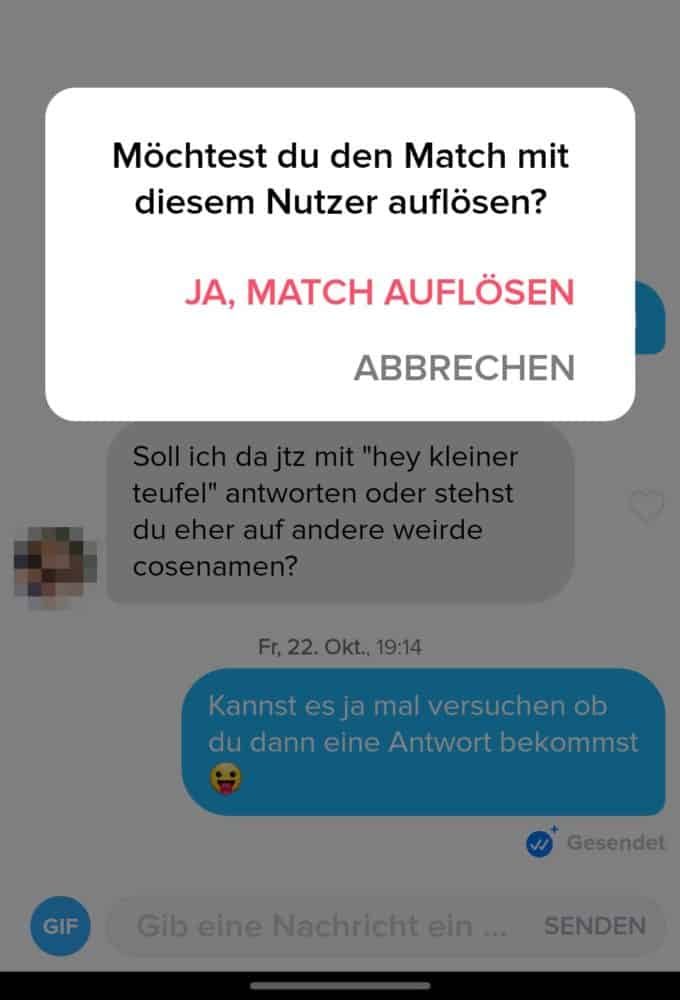 Mit einem Match habe ich ganz kurz geschrieben und wurde dann auf absolut obszöne Weise beschimpft. Ich habe das dann an Tinder gemeldet, leider hat die Person das Match gelöscht bevor ich einen Screenshot machen konnte. Habe dann in der Meldung die mir bekannten Daten angegeben.