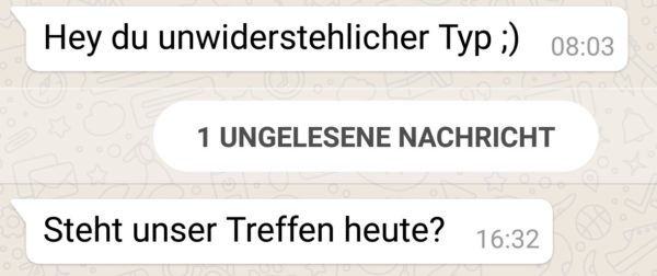 Und hier noch ein Beispiel Chatverlauf, bei dem sowohl die "Ja-Leiter" als auch die Andeutungen verwendet werden, um erfolgreich die Nummer zu bekommen und ein Treffen zu vereinbaren.