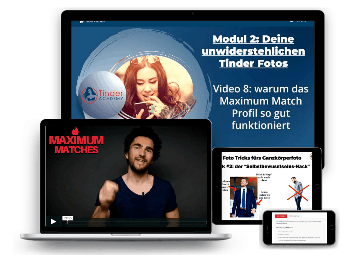 Aber wenn du die Fotos lieber selber machen willst und auf eigene Faust dein Profil optimieren willst, dann schau dir am besten mal unseren "Maximum Matches" Premium Videokurs an. Dort zeige ich dir Schritt-für-Schritt, wie du das perfekte Profil erstellst, wie du attraktiver auf deinen Fotos aussiehst und mit welchen "Profitricks" du das Tinder System austricksen kannst, um mehr Matches zu bekommen.