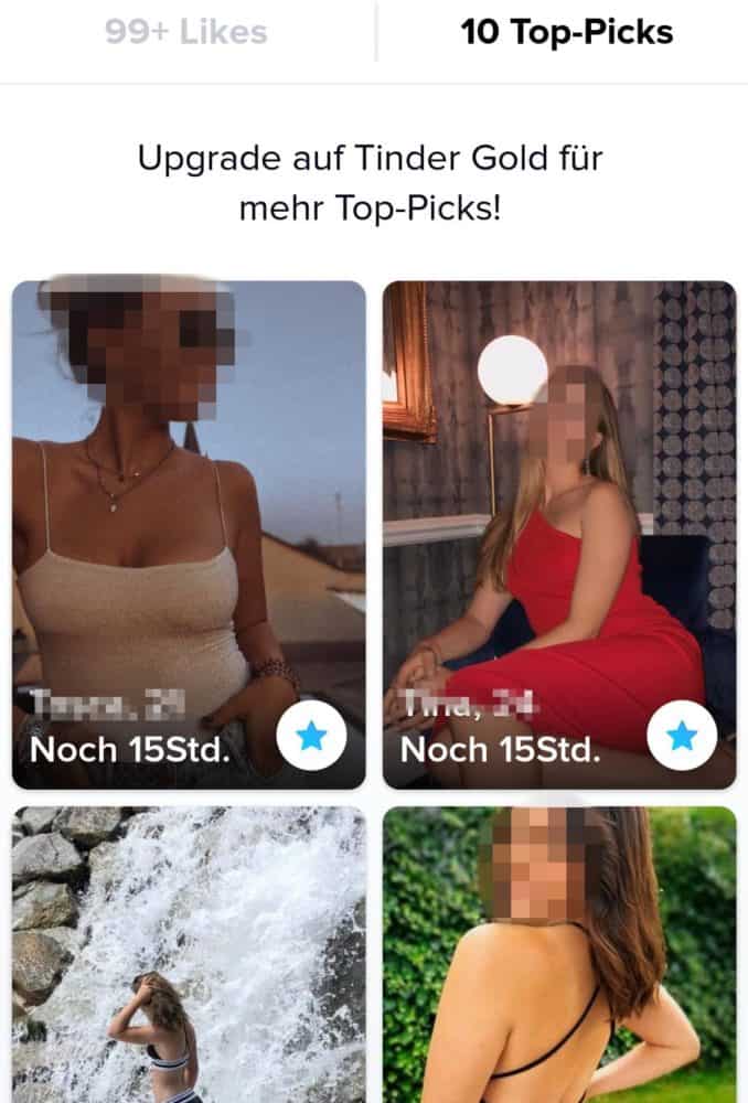 In der Gratis Version von Tinder kannst du jeden Tag einem deiner Top-Picks ein Like geben, hast du Tinder Gold oder Tinder Platin, kannst du alle 10 liken. Wenn dir die 10 Empfehlungen jeden Tag nicht ausreichen, kannst du auch weitere Top-Picks kaufen.